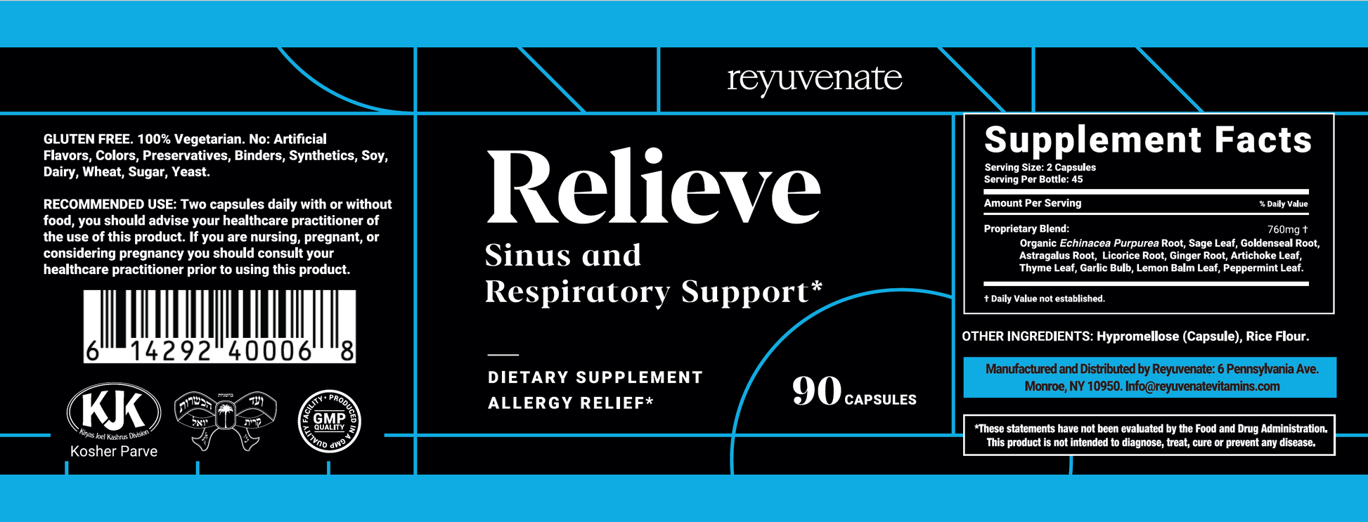 Relieve provides a thorough supplement created to target and strengthen the body's respiratory defenses and to minimize reactions to daily environmental allergens. Relieve includes a powerful blend of herbs, roots, bulbs, and necessary antioxidants that promote the body's natural defense against sinus infections. Taken daily, this restorative blend protects the body against harmful allergens, including Hay and Rose fevers, and helps reduce sinus and respiratory swelling and chest congestion to create a strong respiratory system.